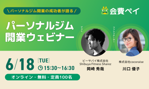 イベント・セミナー2024年6月18日、パーソナルジムの開業検討者やパーソナルジム事業に携わる方に向け、第3回パーソナルジム開業ウェビナーを開催いたしました。 パーソナルトレーニングジム「Sharez」を運営するビーサバイ株式会社代表の岡…