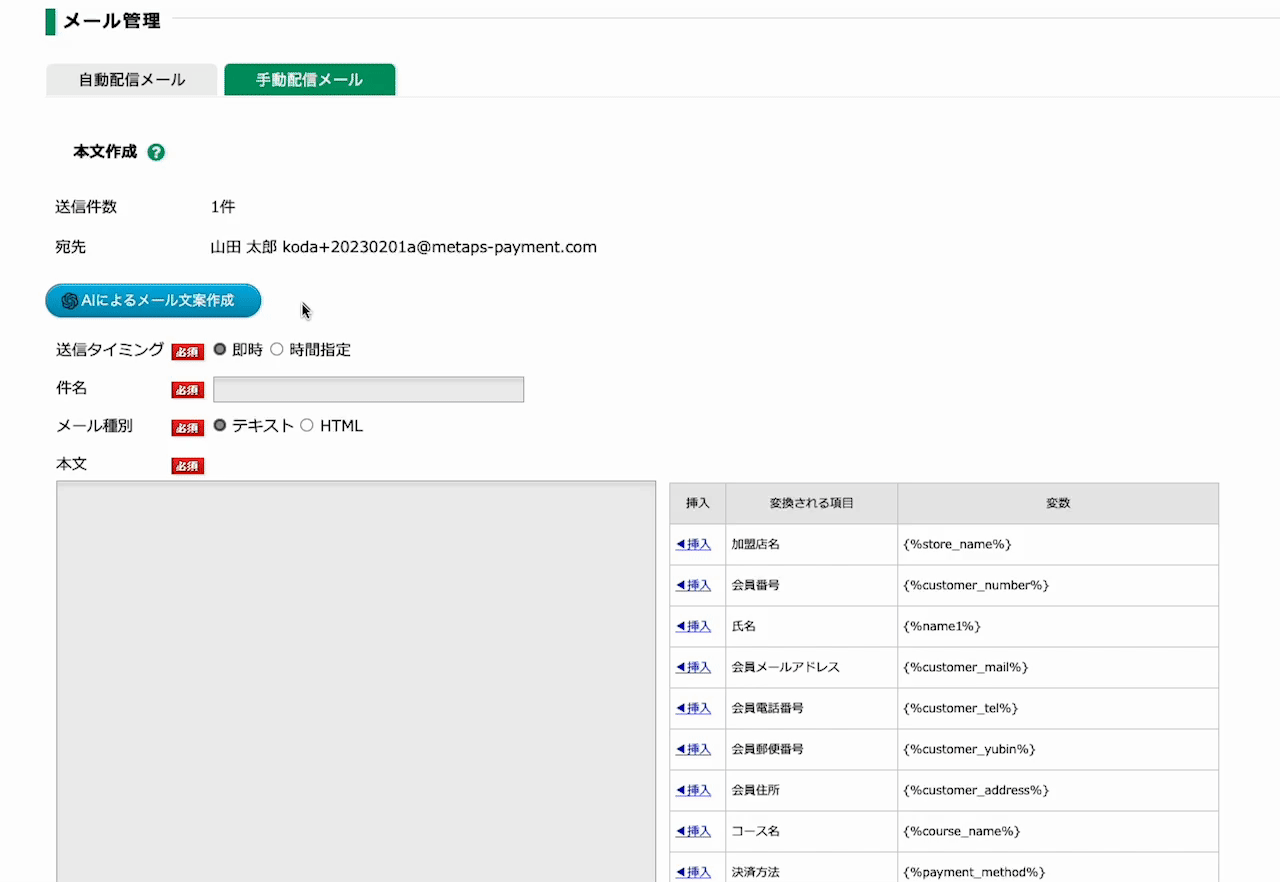 フィットネスジムやスクールのサービス運営者は「営業時間変更連絡」「新サービス案内」「キャンペーン紹介」「イベント案内」など会員様に連絡をする機会が多くあります。会費ペイでは連絡の手段として手動配信メール(LINE含む)を提供していますが、配信だけではなくメール文案の作成までをお手伝いする機能も提供しています。